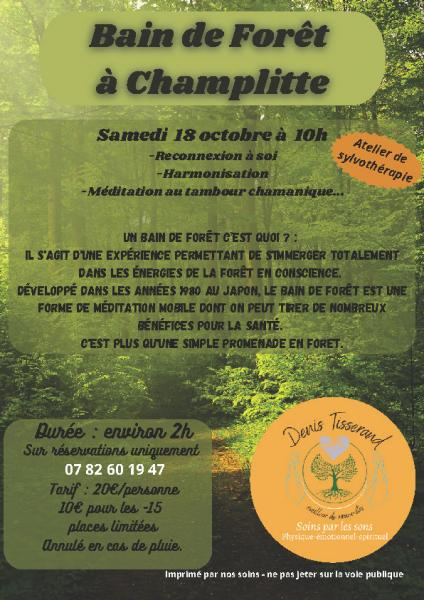 Bain de forêt à 10 h à Champlitte, proposé par Denis Tisserand. Découvrez la forêt au travers d’ateliers de sylvothérapie. Tarif : 20 €, 10 € pour les moins de 15 ans. Places limitées. Sur réservation au 07 82 60 19 47.