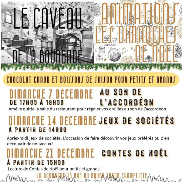 Les dimanches de Noël au caveau du restaurant de la Bourgade à Champlitte de 17 h à 19 h. Brigitte vous embarque pour un moment hors du temps : des histoires pour petits et grands, racontées avec chaleur et simplicité. Sous un plaid, une tasse bien chaude entre les mains, on se laisse porter par la douceur des récits. Infos : 06 50 91 25 53.