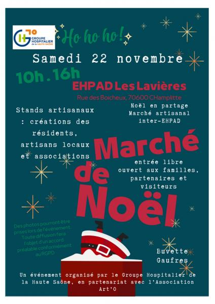 Marché de Noël à l’EHPAD les Lavières à Champlitte de 10 h à 16 h. Marché artisanal inter-EHPAD. Stands de créations des résidents, artisans locaux et associations. Entrée libre, ouvert aux familles, partenaires et visiteurs. Buvette et gaufres sur place. Organisé par le GH de la Haute-Saône en partenariat avec l’association Art’O.