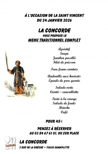 Repas de la Saint Vincent au restaurant La Concorde à Champlitte. Profitez du menu complet pour fêter la Saint Vincent dans la plus pure tradition. Tarif : 45 €. Réservations au 03 84 67 61 01 ou au restaurant.