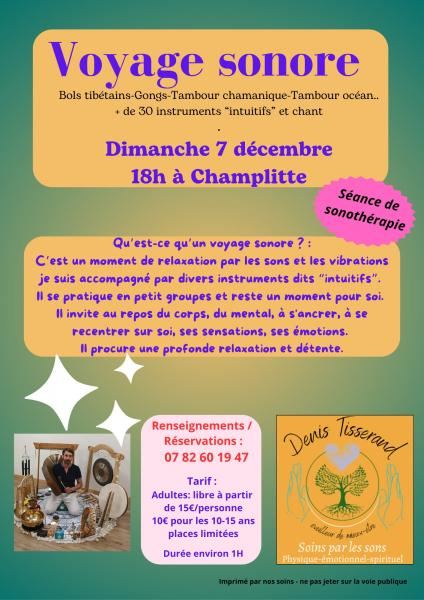 : 0782601947 Le 07/12/2025 Voyage sonore à 18 h à Champlitte, proposé par Denis Tisserand. Apaisement et relaxation au son de bols tibétains, gong, tambour chamanique, tambour océan… Tarif libre à partir de 15 € par personne. Sur réservation au 07 82 60 19 47.